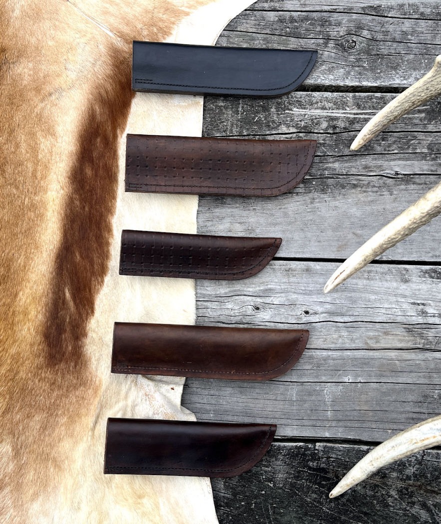 Sheaths are also available for purchase. These are also hand made on site from 4mm to 5mm leather. Some of the forged knives or knives with Antler handles from Red Dear require an individually crafted sheath. These will be quoted with a price including the sheath. Otherwise, the sheath is additional.